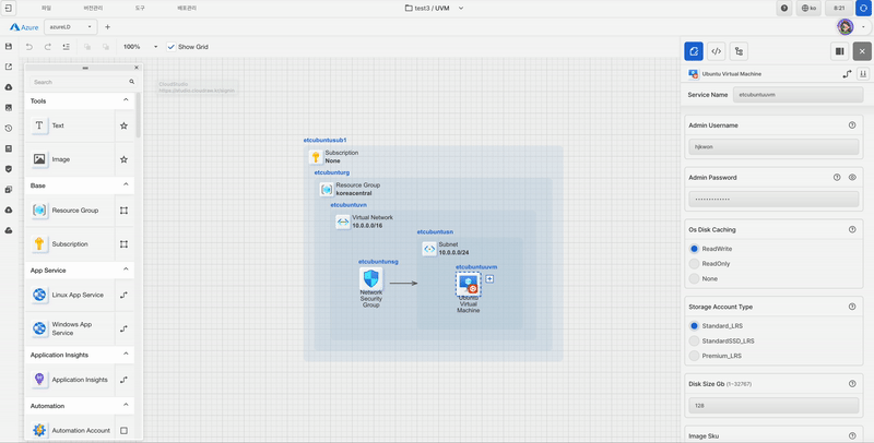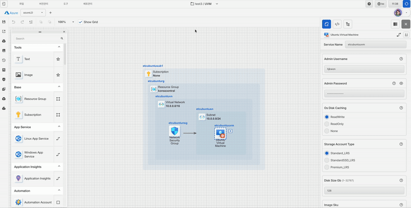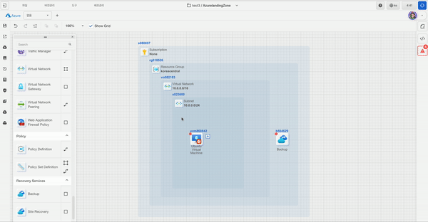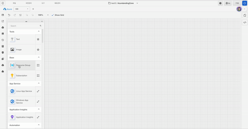 Drag & Drop은 캔버스를 구성할 수 있는 가장 단순한 기능입니다. 좌측 리소스 리스트에서 원하는 리소스를 끌어다 캔버스에 Drag & Drop으로 인프라를 그릴 수 있습니다.