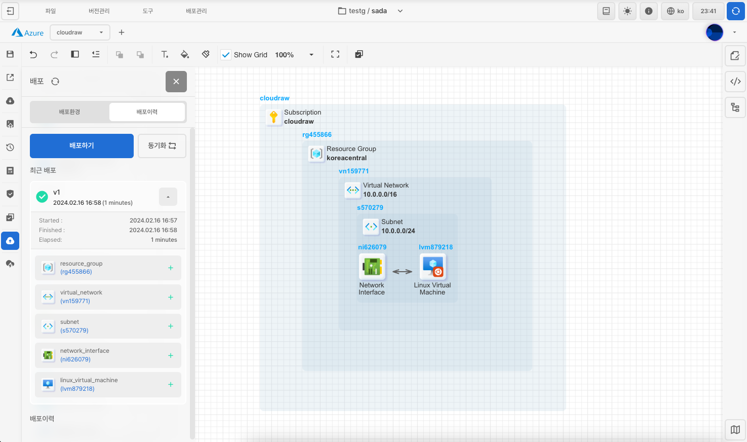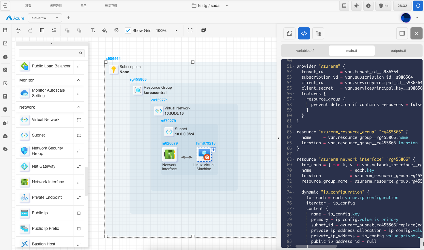 캔버스에 그려진 인프라가 유효하면 해당 인프라를 IaC 코드로 자동 변환하여 제공합니다.