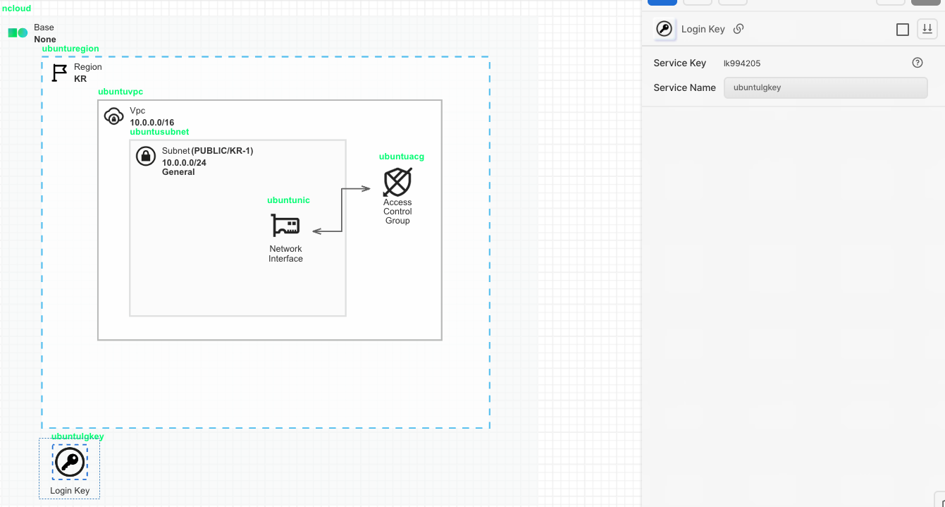 Server 아이콘을 가져온 후 Subnet에 안에 배치시켜 줍니다. Network Interface와 선으로 연결합니다. Login Key를 배치해둔 키를 선택하여 지정합니다.