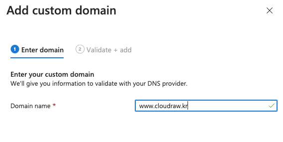 Azure DNS zone을 사용하여 도메인을 구성하였으면 “Custom domain on Azure DNS”를 사용하고, 외부에서 도메인을 구성하였으면 “Custom domain on other DNS”를 선택합니다.