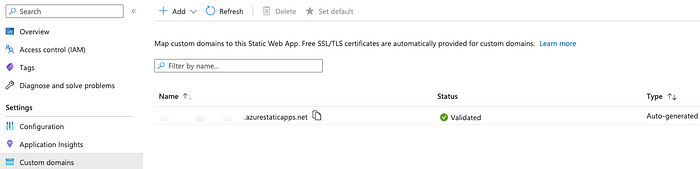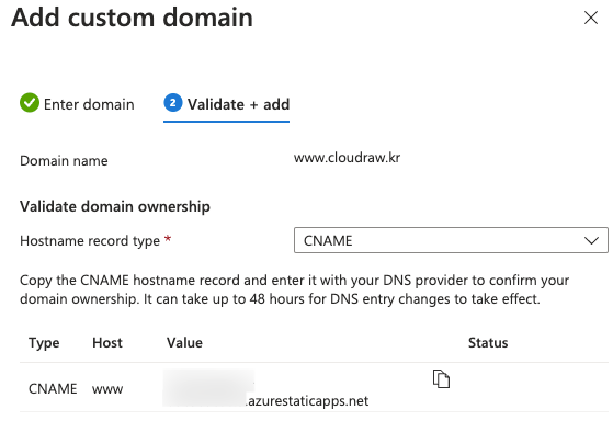 마지막 작업은 도메인 매핑작업입니다. Static web app을 만들면 자동으로 생성되는 Azure도메인과 사용할 사용자도메인을 CNAME 매핑하여 사용할 수도 있습니다.