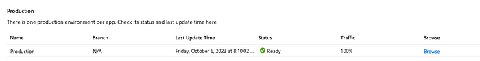 Azure portal > Static Web Apps > Environments에서 Status가 Ready 인 것을 확인합니다.
