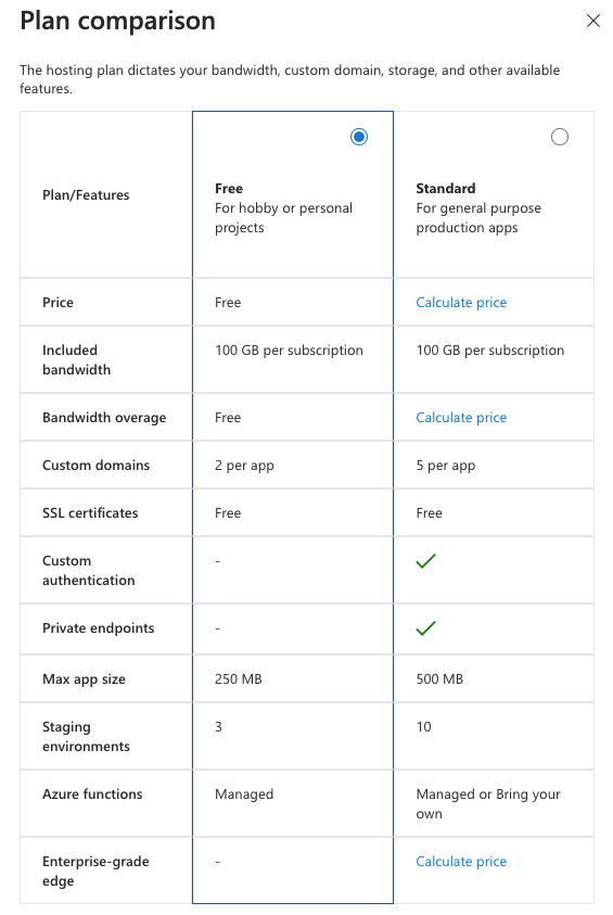 Hosting plan을 간략히 비교해보면 모두 SSL Certificate를 지원하며 Standard는 free와 다르게 Private endpoints와 Custom authentication을 제공하고 있습니다.