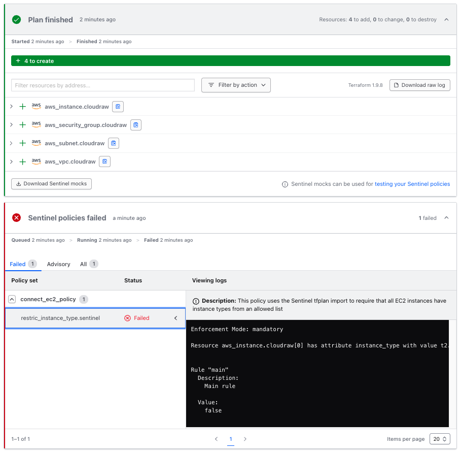 - 정책 설정 이전에는 없던 Task가 추가되었으며 정책에 위배되어 plan 동작 이후 Task가 Failed 상태가 되었습니다.
