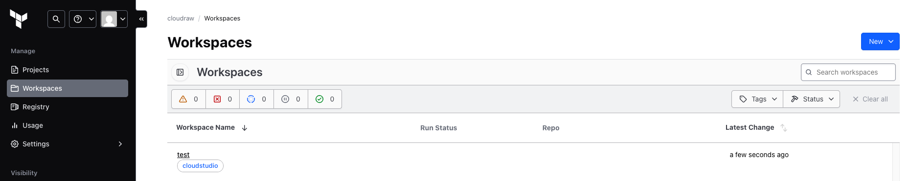 - 이번 글에서는 앞서 코드로 연동한 cloudstudio(Project)의 test(Workspace)에 적용하겠습니다.
