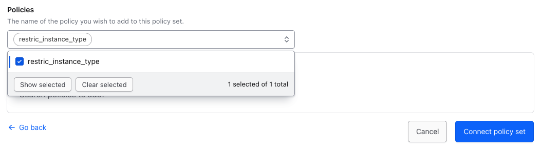 - 생성한 정책을 선택 후 Connect policy set 버튼을 클릭하여 정책을 적용합니다.