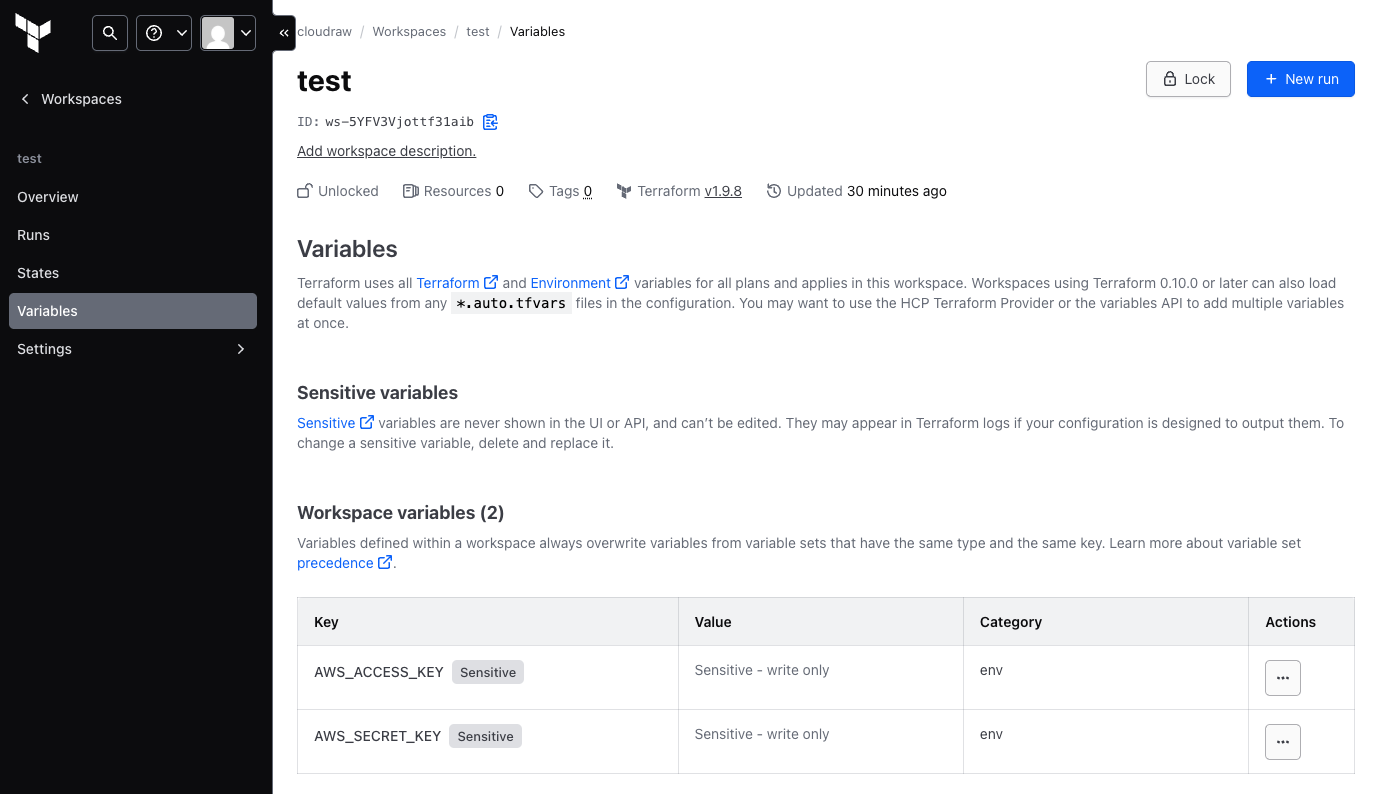 - terraform 명령 실행을 위해 Workspace에 미리 발급받은 CSP의 자격증명을 등록합니다. 자격증명을 Variables에 등록함으로써 코드상에서의 노출을 방지할 수 있습니다. 키 등록시 Sensitive를 체크하여 유출을 방지하세요!