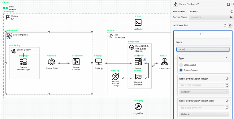 Source Pipeline 아이콘을 가져와 Region 안에 배치합니다. Source Pipeline은 SourceCommit, SourceBuild, SourceDeploy 서비스를 통합하여 빠르고 안정적인 소프트웨어 출시를 위한 프로세스 자동화 서비스입니다. 우선은 Source Pipeline 리소스를 Region 위에 올려만 놓고, 옵션 값 설정은 SourceCommit, SourceBuild의 옵션 설정이 끝난 후에 진행합니다.