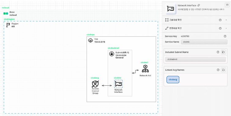 Network Interface 아이콘을 가져와 Subnet 안에 배치합니다. Network Interface는 Ubuntu Server에 할당할 수 있는 네트워크 인터페이스를 생성하는 서비스입니다. 앞서 생성한 Access Control Group과 선으로 연결하여 트래픽을 통제합니다.