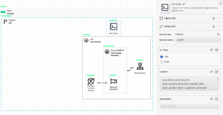 InitScript 아이콘을 가져와 Region 안에 배치합니다. Init Script는 사용자가 미리 작성한 스크립트를 서버가 생성될 때 자동으로 실행해주는 서비스입니다. Source Deploy를 사용하려면 Ubuntu Server에 SourceDeploy용 agent가 설치 되고 실행 상태여야 합니다. InitScript를 통해 서버 생성과 동시에 Source Deploy용 Agent를 설치할 수 있도록 합니다. 또한 이번 시나리오에서는 Nginx를 통해 정적 웹페이지를 보여주므로 Nginx도 같이 설치합니다.