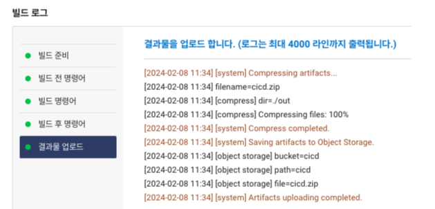 빌드 작업이 정상적으로 완료되면 Objectstorage에 저장된것을 확인할 수 있습니다. 아래의 빌드 작업 로그를 보면