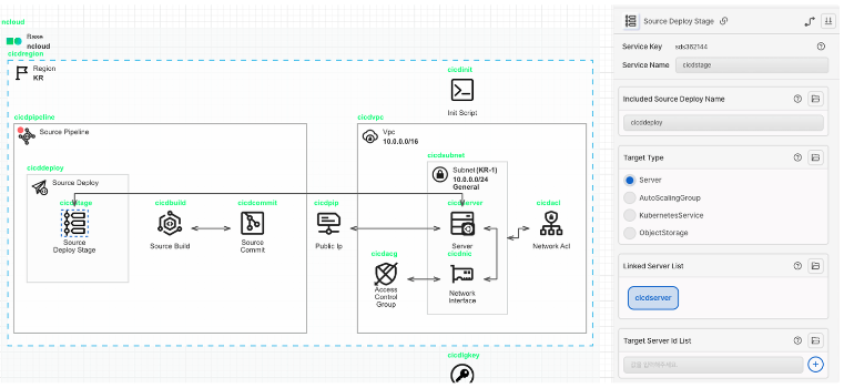 Server 아이콘을 가져와 Subnet 안에 배치합니다. SourceDeploy의 대상이 되는 Ubuntu Server를 생성합니다. Network Interface와 선으로 연결하고, 각각 위에서 생성한 LoginKey와 InitScript를 옵션 값으로 설정합니다.