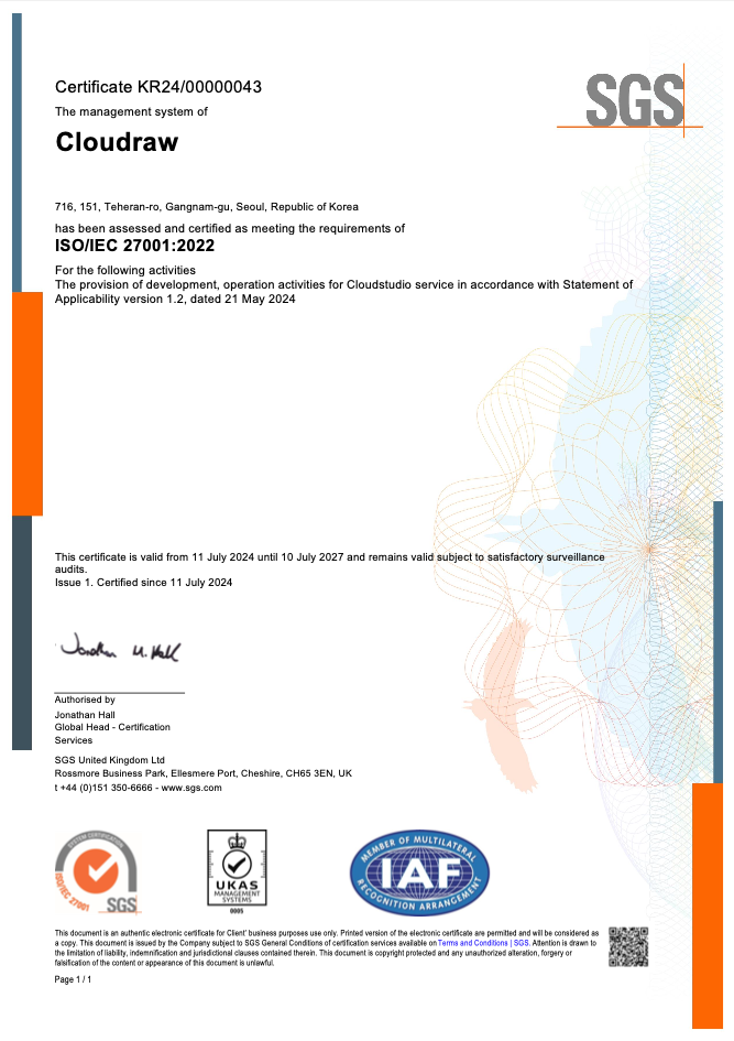 클라우드로가 7월 11일 정보보안경영시스템(ISMS, Information Security Management System) 관련 국제표준 인증 ‘ISO 27001’을 획득했습니다.